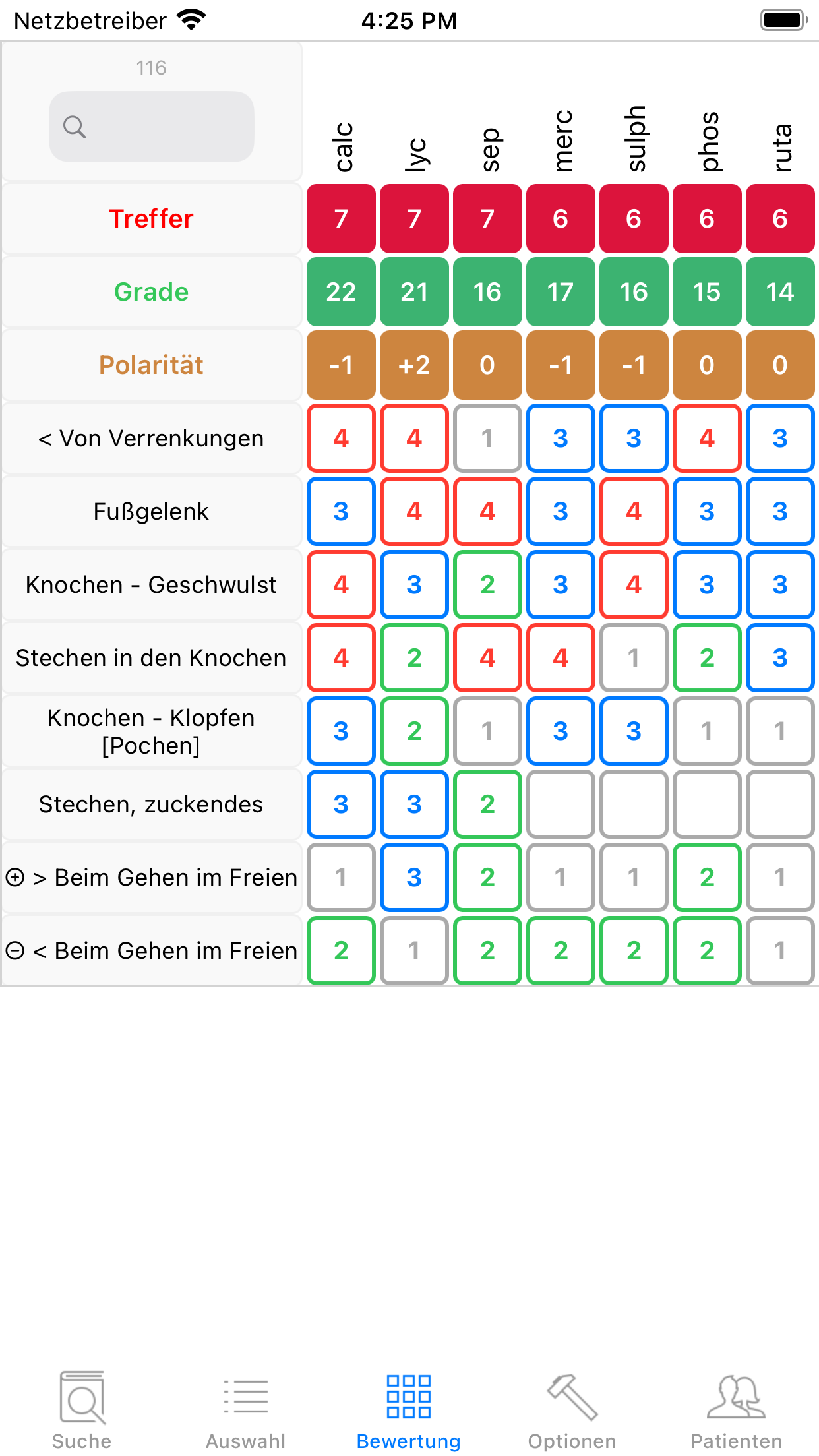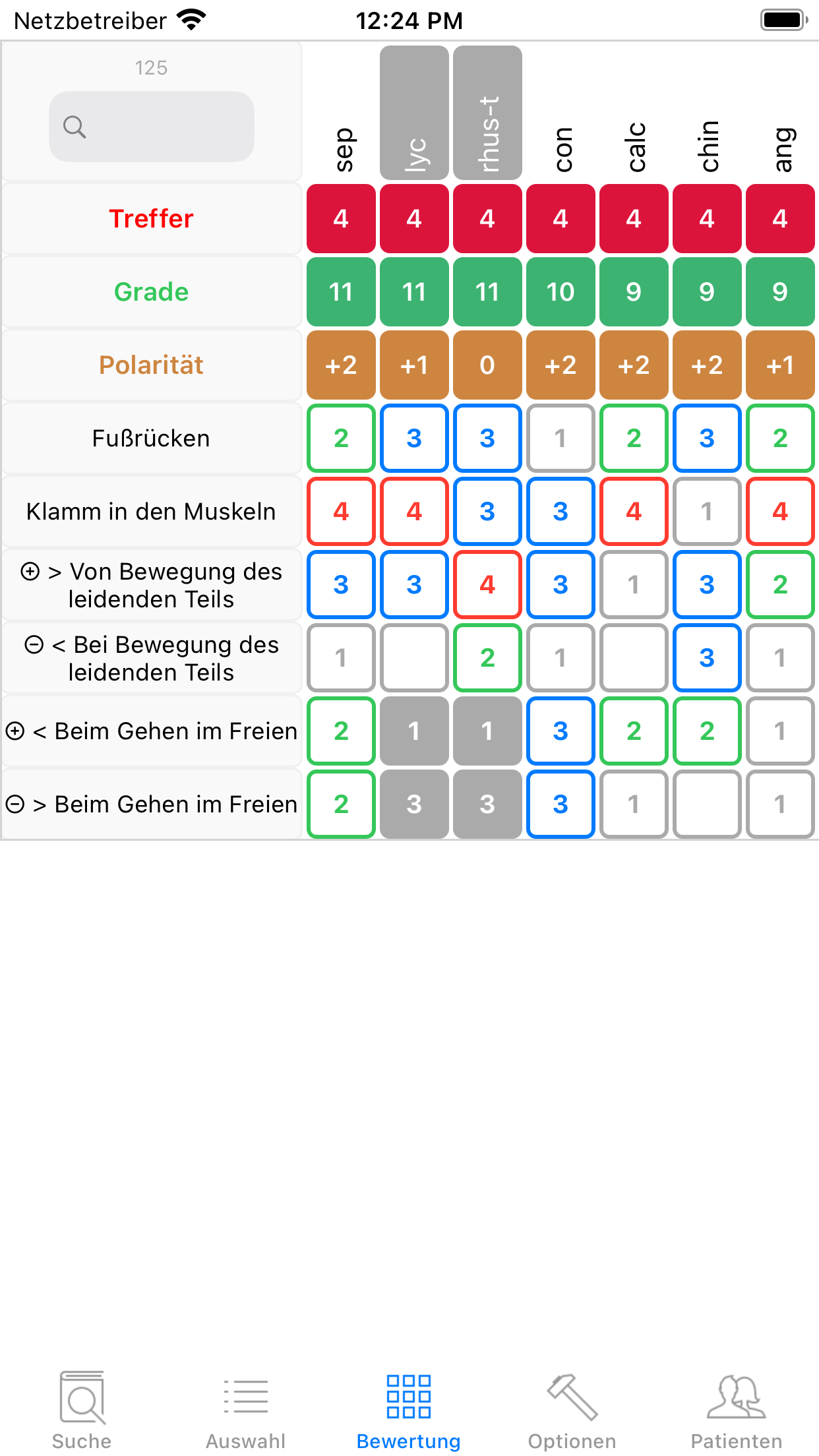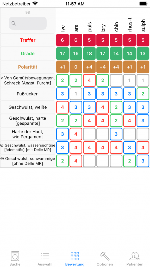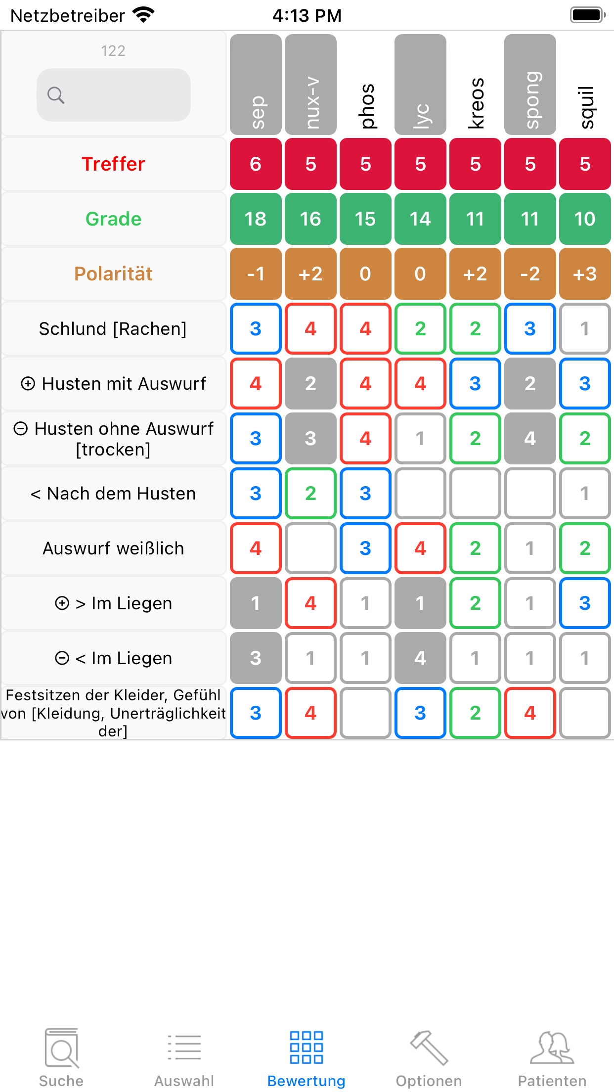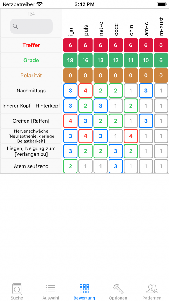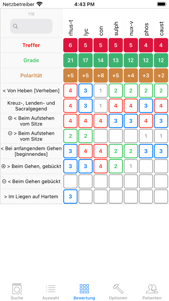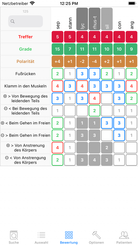Sepia steht an erster Stelle, ist aber im obigen Raster kontraindiziert (grauer Hintergrund). Kann es trotzdem das richtige Mittel sein ? Die Rubrik Verschlimmerung im Liegen hat den Grad 3, was bedeutet, dass Sepia in vielen Symptomen vorkommt, die im Liegen verschlimmert werden, aber seine Gegenrubrik Besserung im Liegen hat den Grad 1, sondern nicht den Grad 0, was bedeutet, dass es ein, vielleicht ein paar Symptome gibt, die durch Sepia im Liegen gebessert werden. Um das zu entscheiden, muss man in der Materia Medica nachschlagen.