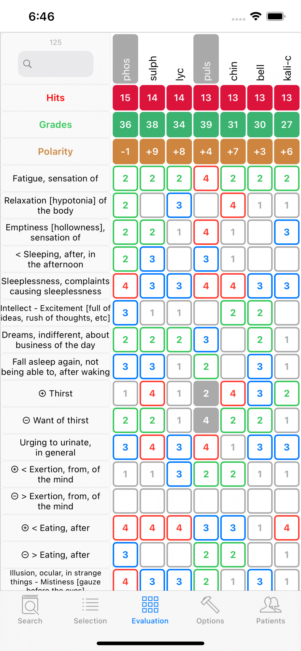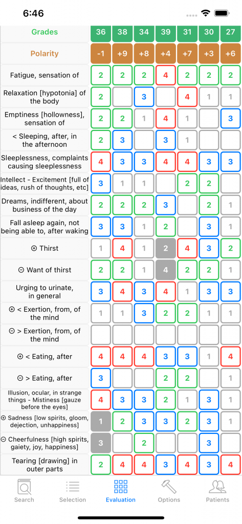 Sepia comes in first but is contraindicated (shaded background) in the grid above. Can it nevertheless be the right remedy ? The rubric Aggravation while lying has a grade 3, meaning Sepia appears in many symptoms aggravated while lying, its counter-rubric Amelioration while lying has grade 1 but not 0, important difference meaning there exist one, perhaps a few symptoms of Sepia ameliorated while lying. One has to look up in the Materia Medica to decide.